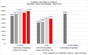 Die Vergütung von Caritas-Pflegefachkräften liegt gut 5 Prozent über dem Branchendurchschnitt in der Altenpflege. Bei Pflegehilfskräften sind es sogar mindestens 15 Prozent (mehr bei der Caritas). Die Ergebnisse der Studie zeigen außerdem, dass in der Altenpflege – entgegen der in der Öffentlichkeit weit verbreiteten Meinung – auch im Vergleich zu anderen Branchen überdurchschnittlich vergütet wird. Das gilt bei Fachkräften sowohl mit Blick auf Berufe in der Industrie (hier Mechatronik) als auch im Vergleich zum Durchschnitt über alle Berufe.