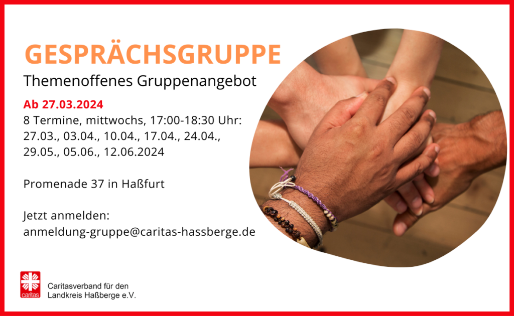 Der Sozialpsychiatrische Dienst der Caritas bietet im März eine Gesprächsgruppe an. Diese findet ab 27.03.2024 von 17:00-18:30 Uhr im Haus Sankt Bruno, 3. Stock (Promenade 37, 97437 Haßfurt) statt. Die...