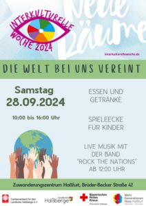 Am Samstag, den 28. September 2024, öffnet das Zuwanderungszentrum Haßfurt seine Türen für die Interkulturelle Woche, die dieses Jahr unter dem Motto „Die Welt bei uns vereint“ steht. Von 10:00 bis 16:00 Uhr sind alle herzlich eingeladen, an diesem besonderen Tag teilzunehmen und die Vielfalt unserer Gemeinschaft zu feiern.